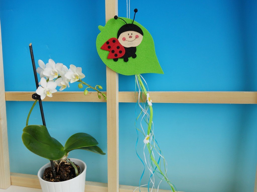 Berušce vybarvíme nos a domalujeme tváře. Na vršek výseku hlavy nalepíme černý výsek. Křídla slepíme mírně přes sebe a nalepíme na ně puntíky. Papírový motouz vlepíme do kuliček a složíme do tvaru "V" (tykadla). Tykadla přilepíme zezadu k hlavě. Hlavu přilepíme na tělo, zespodu těla nalepíme nohy. Berušku nalepíme na list tak, aby tykadla přesahovala ven, dolepíme křídla. Prameny tenkého lýka přeložíme na polovinu a uvážeme uzlík. Slepíme kopretiny a nalepíme je na na širší lýko. Obě lýka nalepíme zezadu do spodní části listu. Z provázku vytvoříme poutko na zavěšení a nalepíme ho zezadu k vrchní části listu.