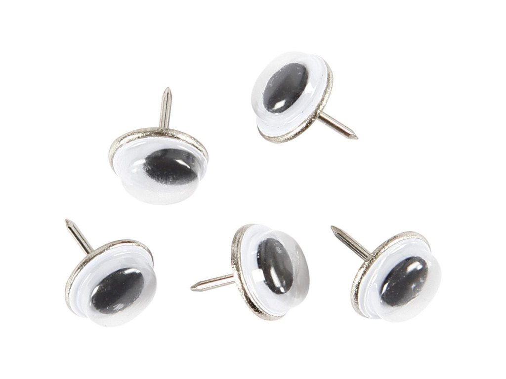Dekorační oči, bílé s pohyblivou panenkou, připínačky. Dobře drží na výrobcích z polystyrenu či modelovací hmoty. Balení 25 ks, velikost 10 mm. Nevhodné pro děti do 3 let.