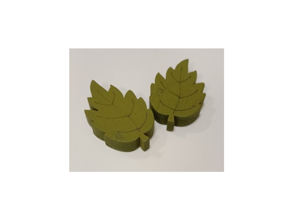 Drobná dřevěná dekorace - list zelený, velkost cca 4,4 x 2,6 x 0,7 cm. V balení 2 ks. Nevhodné pro děti do 3 let.