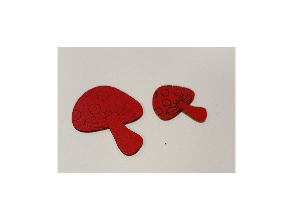 Drobná dřevěná dekorace - muchomůrka, velkost cca 5 x 4 cm a 3,5 x 2,8 cm. V balení 2 ks. Nevhodné pro děti do 3 let.