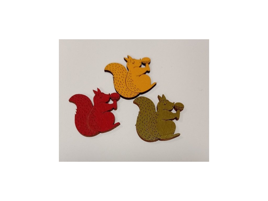 Drobná dřevěná dekorace - veverka, velkost cca 3 x 3 cm. V balení 3 ks v barvách červená, zelená, žlutá . Nevhodné pro děti do 3 let.