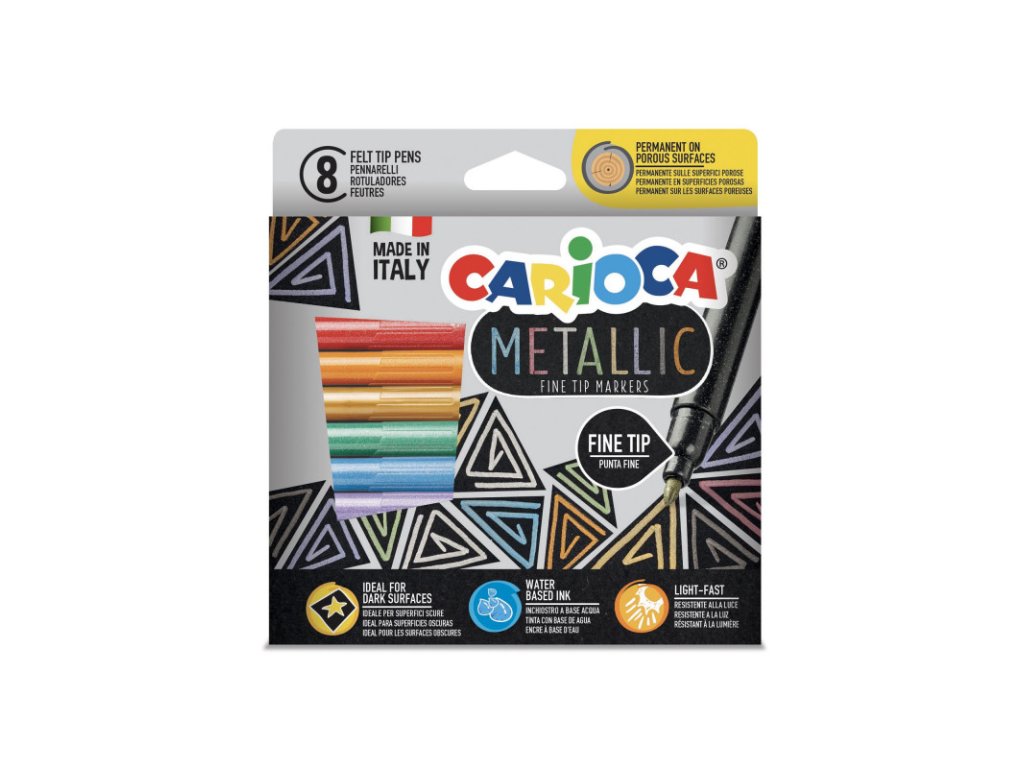 Sada metalických fixů s inkoustem na vodní bázi na akrylovém základě. Tloušťka hrotu 2,6 mm. V balení 8 metalických barev. Tělo fixy vyrobeno z 53 % z recyklovaného plastu. Nevhodné pro děti do 3 let.