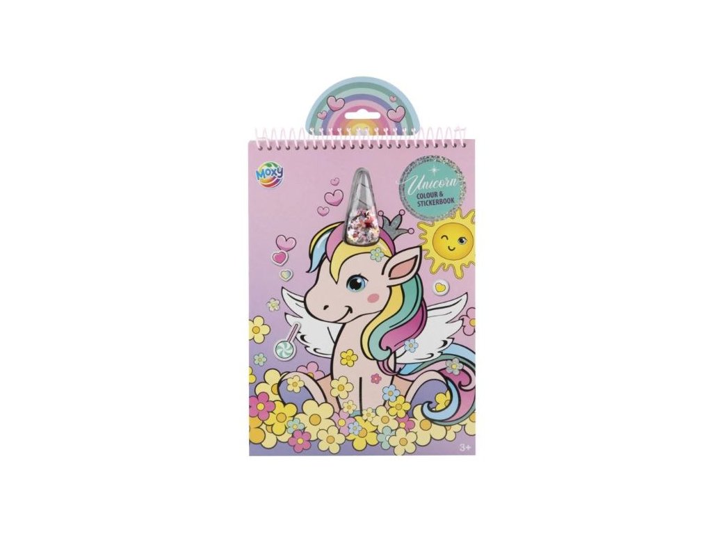 Omalovánky - kniha s motivy jednorožců, 2 listy samolepek, pevné desky. Nevhodné pro děti do 3 let.