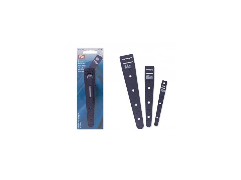Plastový navlékač pruženek a stuh. 3 ks na kartě s otvory pro šířky 6, 12 a 18 mm. Nevhodné pro děti do 3 let.