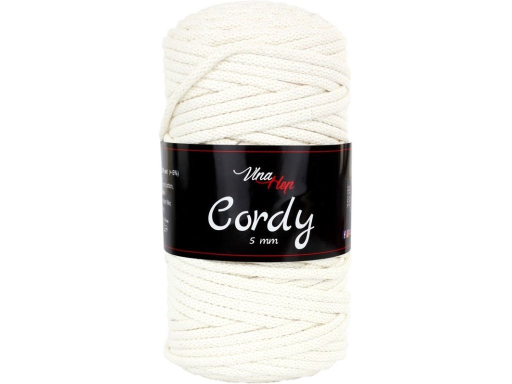 Příze Cordy je silná dutinkové příze - šňůra s polyesterovou výplní. Určené především pro výrobu bytových doplňků a dekorací, jako jsou háčkované košíky, koberce, rohožky, tašky,, sedáky na židle, pufy nebo taburety, košíky, obaly na květináče atd. Šnůry lze využít i do šitých projektů na stahování kapucí, tepláků atd.