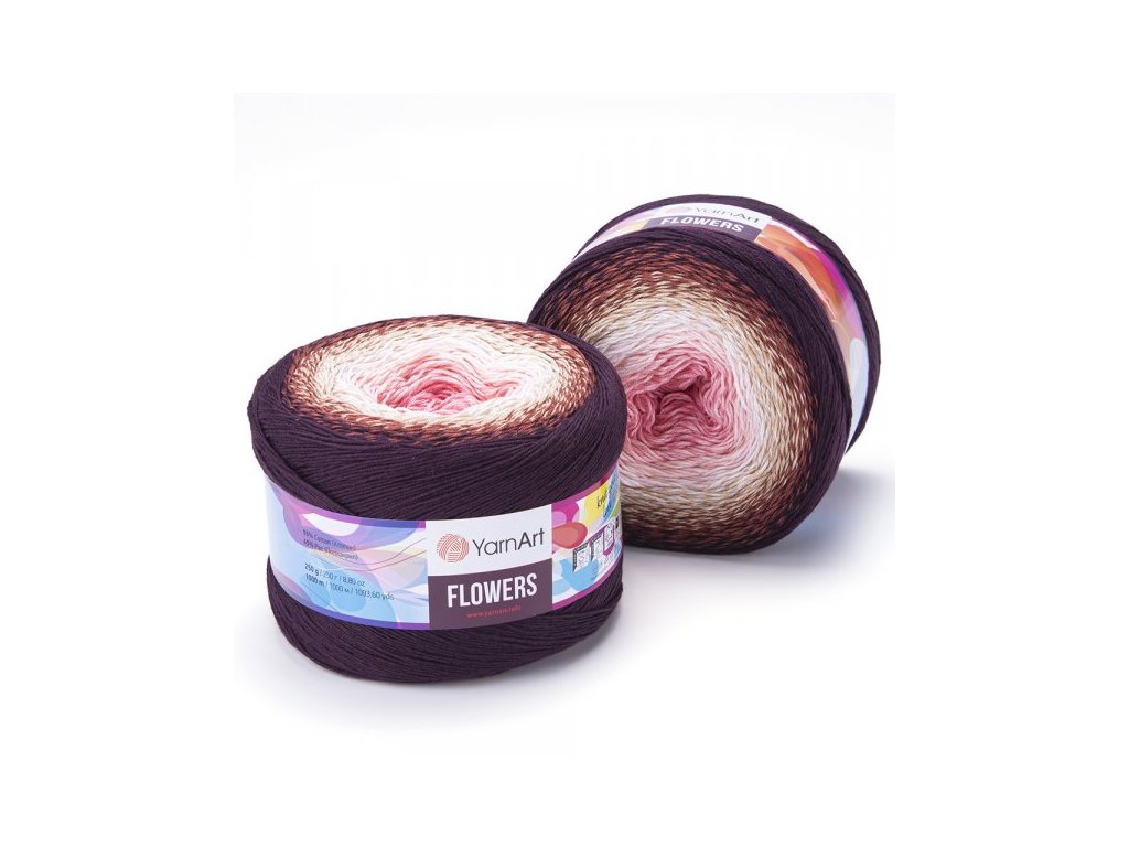 Pletací a háčkovací příze Flowers. Složení: 55% Bavlna - 45% Polyakryl. Hmotnost 250 g, návin 1000 m. Velikost jehlice/háčku 2,5/3.