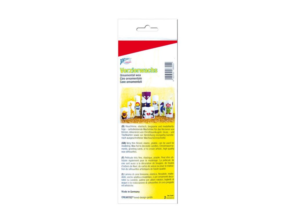 Voskový plát vhodný k dekorování svíček, případně papíru. Rozměr 220 x 80 x 0,5 mm. Ohebný a tenký. Balení obsahuje 2 ks. Opatřený ochranou folií. Nevhodné pro děti do 3 let.
