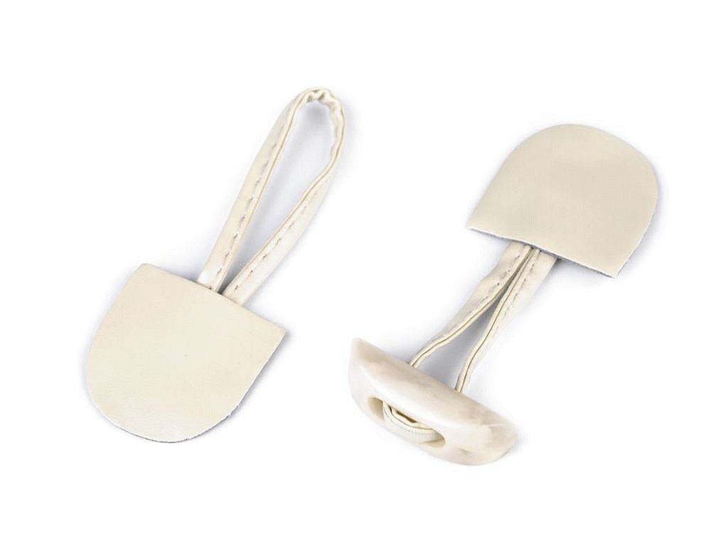 Zapínání z eko kůže. Využijete ho na kabáty, svetry, saka nebo kožichy. Je vhodné také pro šití duffle coat. Rozměry knoflíku: 1,3 x 3,7 cm. Délka poutka: 5 cm. Celková délka po zapnutí: 15 cm. Nevhodné pro děti do 3 let.